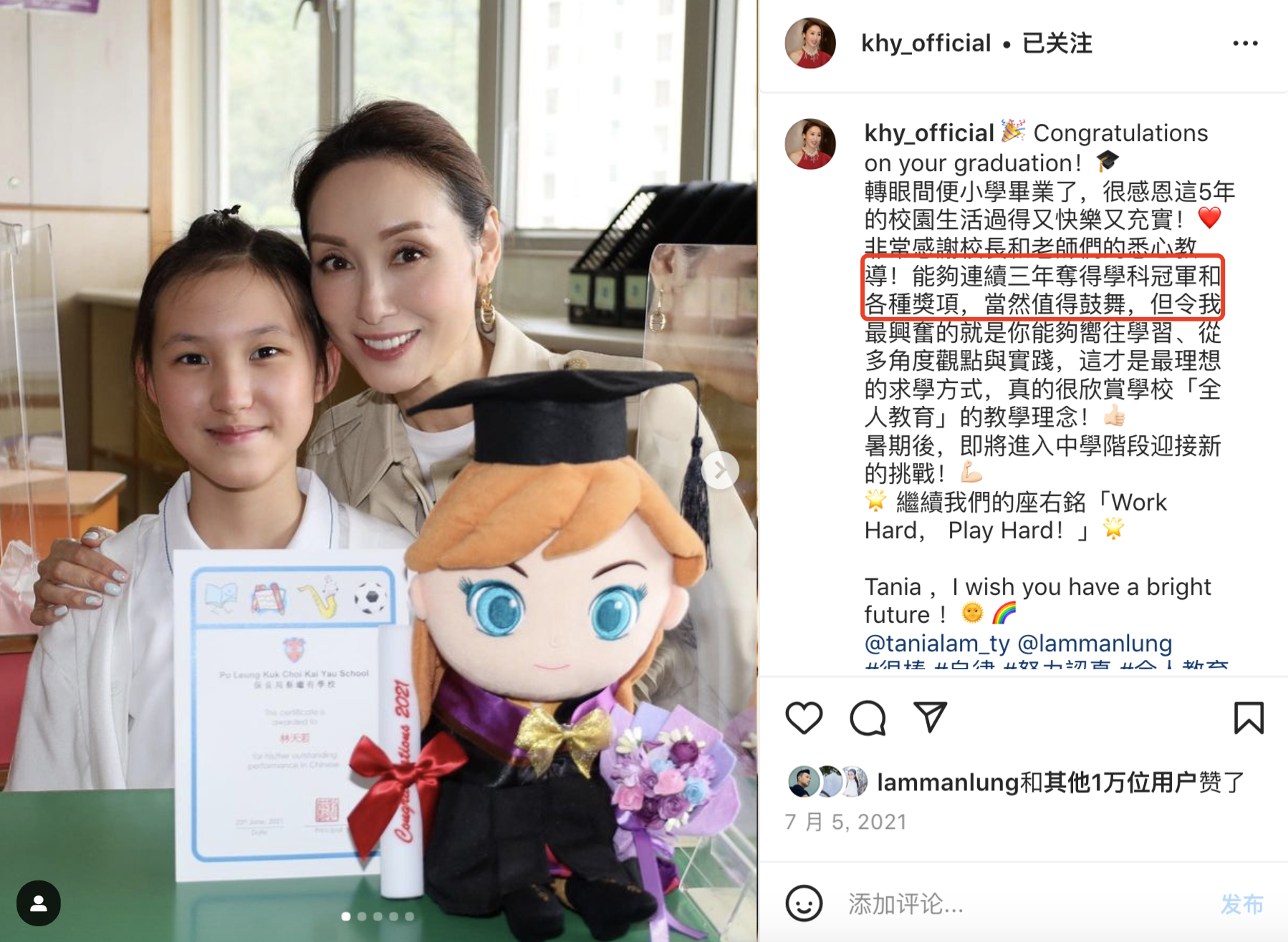 郭可盈曾多次发文透露女儿是一个学霸,在上小学期间连续三年获得了学科冠军和各种奖项,做父母的一定很省心。