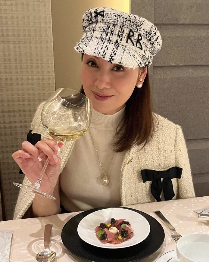 郭可盈手举高脚杯,笑容温柔。不过这张照片还是能明显看出郭可盈的双眼已经有了岁月的痕迹。