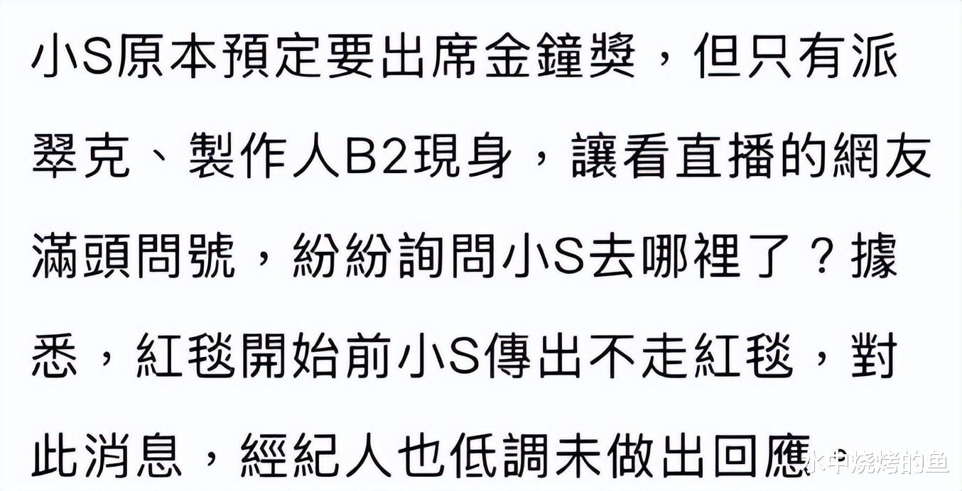对于小S缺席红毯环节,台媒也表示很遗憾,不过小S本人及经纪公司并没作出回应。派翠克、B2走红毯时,台下观众询问小S情况,对于小S是否临时取消走红毯,两人表示不清楚具体原因。不过他们在休息室看到小S,直言她本人素颜状态很好,心情也比较平静。