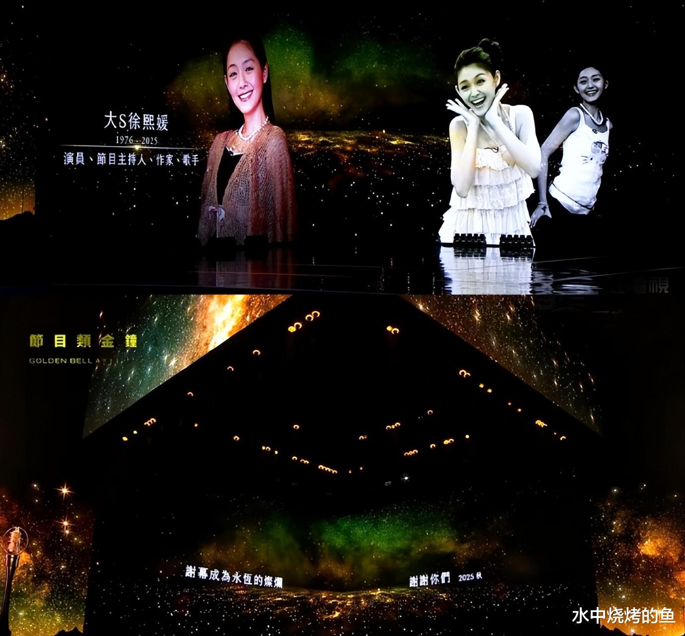 红毯过后,颁奖典礼开启。正如很多人事先所料想的那样,颁奖典礼上悼念了大S等已故电视人。主办方展示了大S的生前影像,给其标注的身份是演员、节目主持人、作家、歌手,现场配文“谢幕成为永恒的灿烂,谢谢你徐熙媛”。