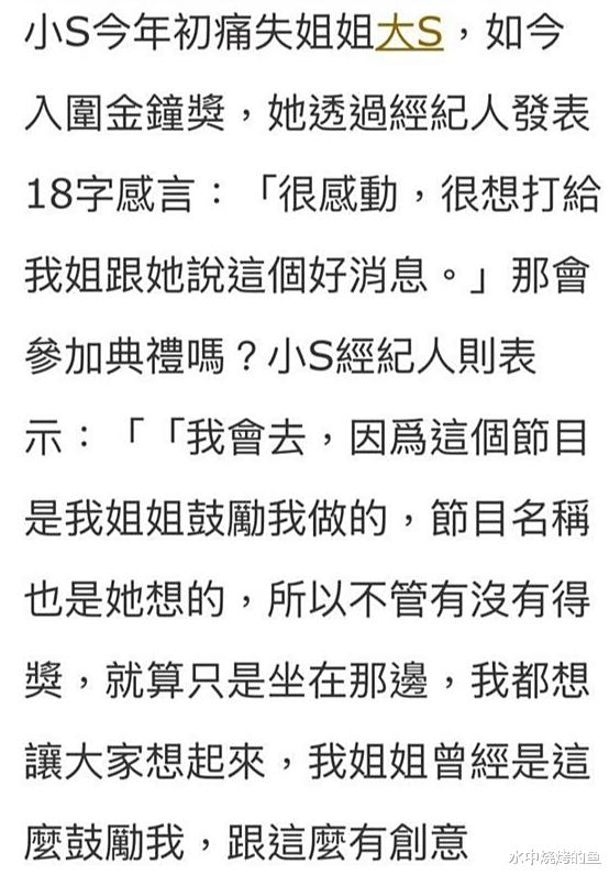 台媒对此事进行了跟踪报道,小S在获得提名后也非常激动,直言想打个电话,把这个好消息告诉姐姐大S。经纪人接受采访时表示,不管有没有得奖,就算只是坐在那边,都想让大家想起大S曾经是这么鼓励自己。