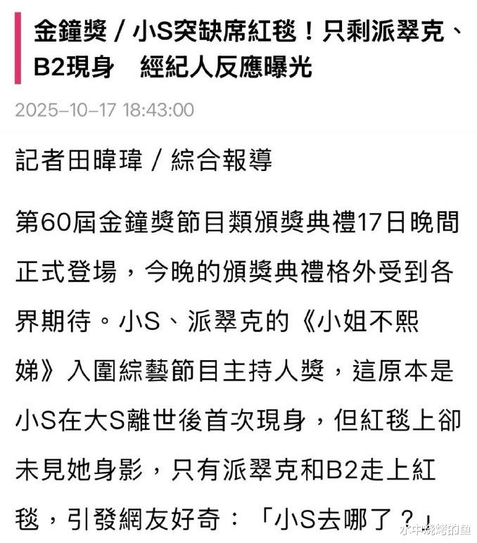 小S凭借综艺《小姐不熙娣》入围第60届金钟奖综艺节目主持人奖,早前她也通过媒体确定会出席颁奖典礼。大S离世后小S对外宣布停工疗伤,此次也是她停工半年后正式复工。