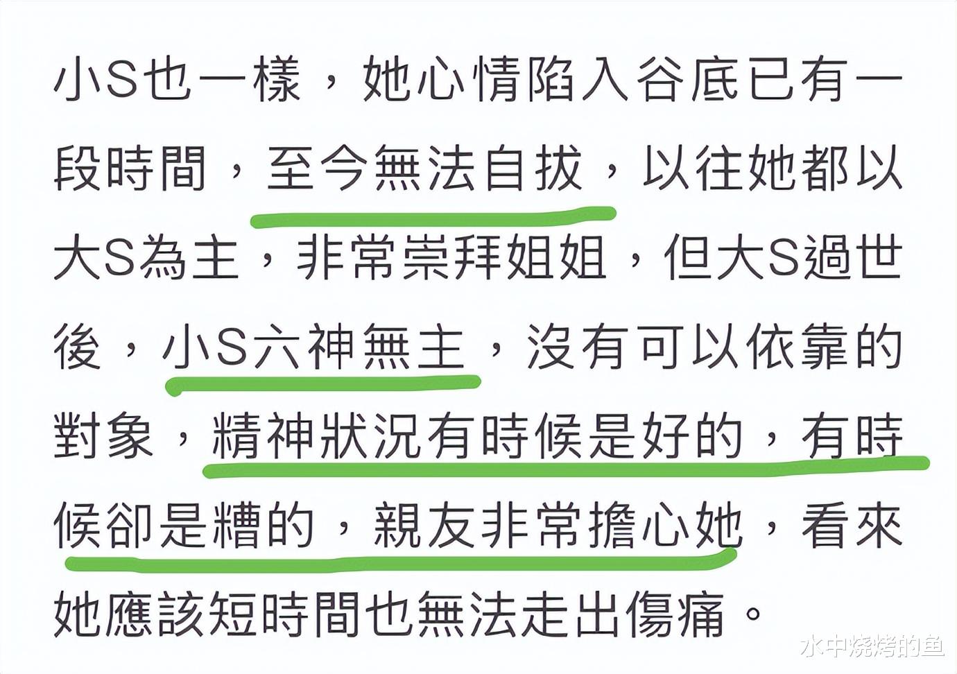 大S很早就带着小S闯荡江湖,姐妹两人相互扶持,也是娱乐圈的典范。小S策划了一家人的赴日旅行,姐姐的离去,对于小S的打击非常大,处理完姐姐的后事,小S基本就是“隐身”的状态,亲友给她发消息也不愿意回复,面对外界的质疑也没有出面回应,整个人的精神状态让人担忧。