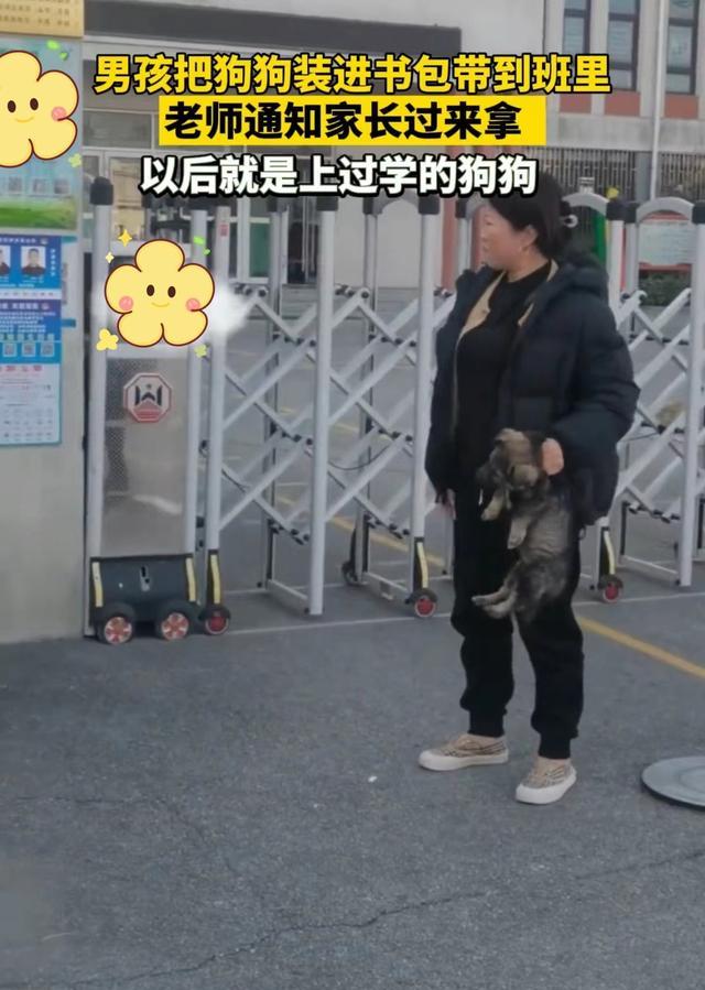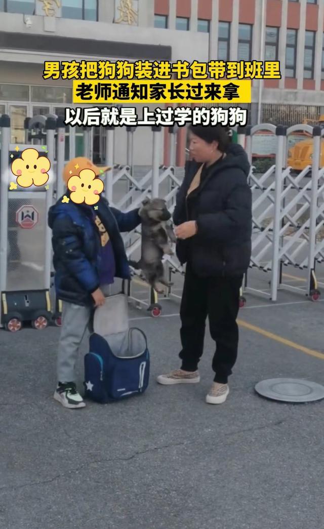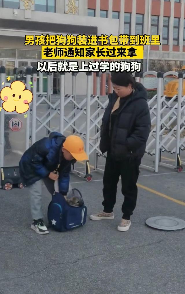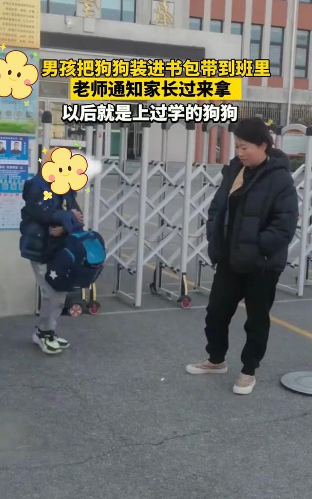 就像这位小男孩一样,他把家里的狗狗装进书包带去学校,被老师发现后联系家长前来认领,校园门口,母子俩的举动亮了。