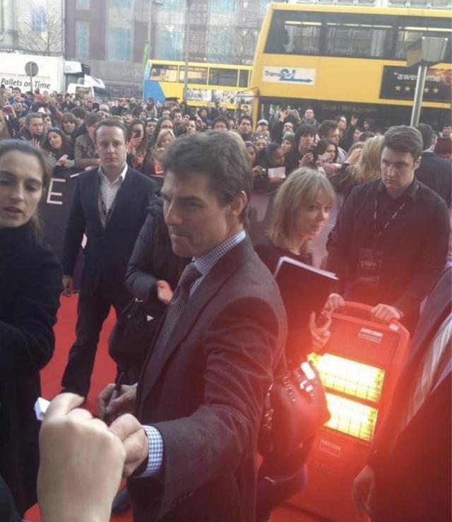 汤姆·克鲁斯参加电影首映式时衣着单薄,身后有人拿着烤火炉给他供暖,这位影迷太热心了。