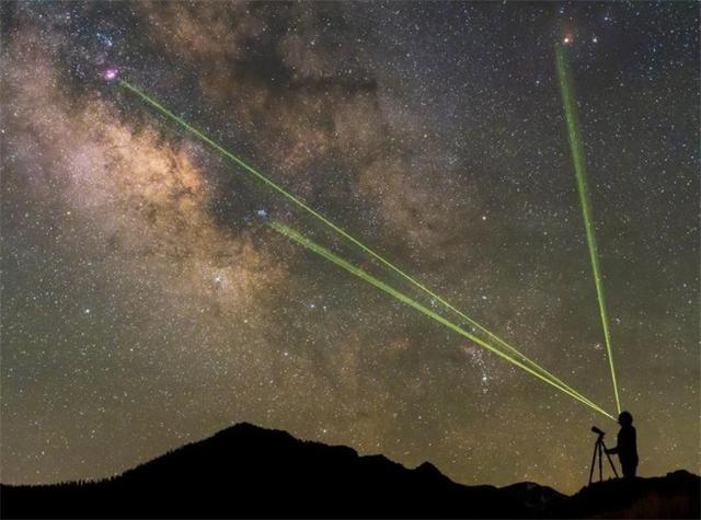 芝加哥天文爱好者将绿色激光指向银河,标注出是三个明亮的星星。