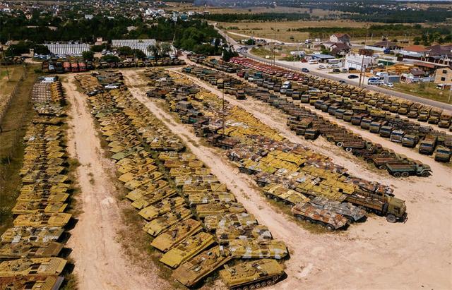 苏联废弃的武器库,停放着BTR'、BMP's、卡车。