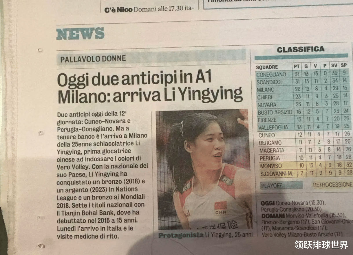 近日,中国女排李盈莹加盟意大利女排联赛豪门米兰俱乐部,引发当地媒体广泛关注。其中出版的意大利报纸在醒目版面刊登了李盈莹的照片,并以Milano: arriva Li Yingying(李盈莹抵达米兰)为标题,对这位中国主攻的到来进行报道。与此同时,另一位中国女排现役主攻庄宇珊也已踏上前往意大利的旅程,将加盟圣乔瓦尼女排,继朱婷之后,中国现役女排球员“集体征战意甲”的格局初步成型。