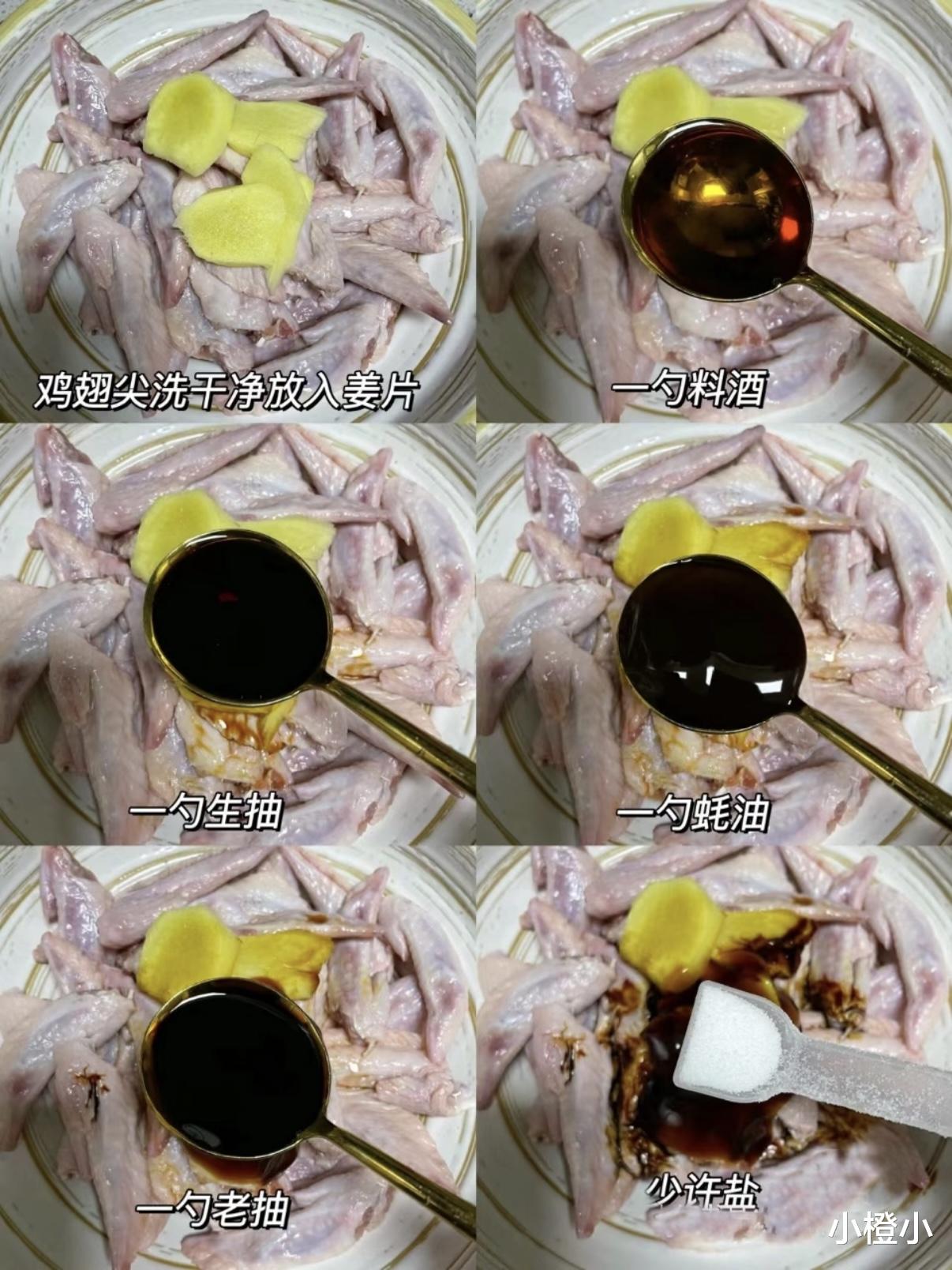 Step1 清洗:鸡翅尖倒盆里,加1勺面粉+清水,抓1分钟,面粉能带走表面油脂和杂毛,冲水后沥干,厨房纸拍拍更干,腌料才挂得住。