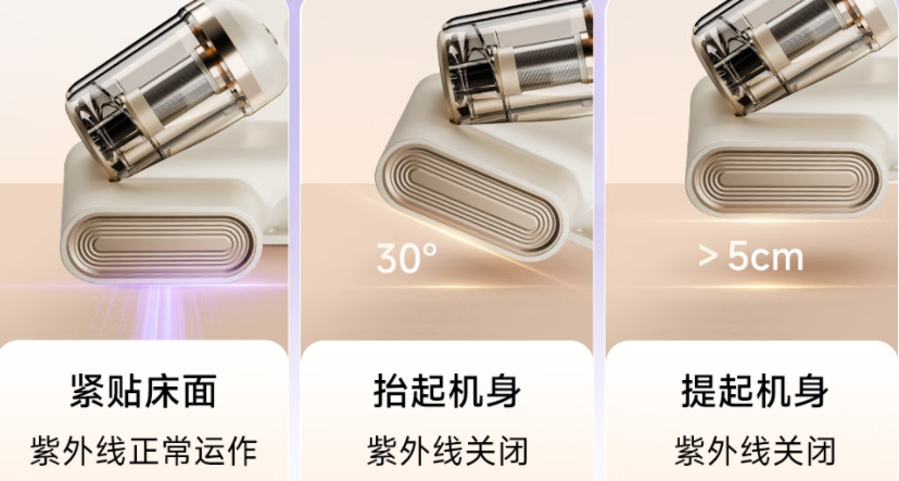 带有紫外线灯的除螨仪,要确认是否有感应装置,在离开物体表面时能自动关闭,避免紫外线直射伤害;同时,机身的材质是否安全、电路是否稳定也很重要。