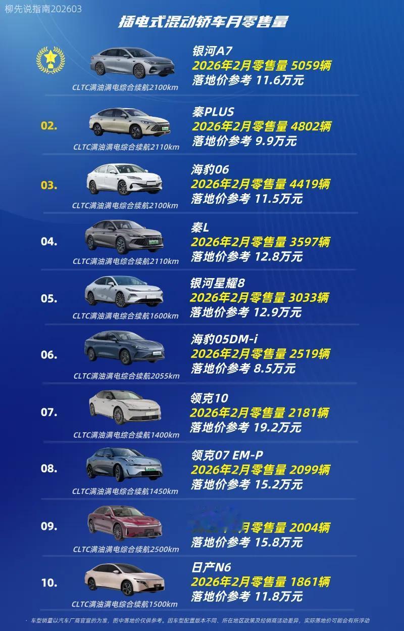 2026年2月,插混轿车销量前三甲:银河A7、秦PLUS、海豹06,销量分别为5059辆、4802辆和4419辆,这三款热销车型综合续航均超2000公里。银河A7凭借其综合产品力登顶榜首,反映出消费者对新一代插混车型在设计、智能化以及驾乘体验方面的高要求。比亚迪秦PLUS作为新能源汽车市场的常青树车型,销量依旧坚挺,显示出其强大的市场口碑和用户基础。海豹06则凭借更运动化的定位和更高的技术含量,成功吸引了追求品质的消费群体。