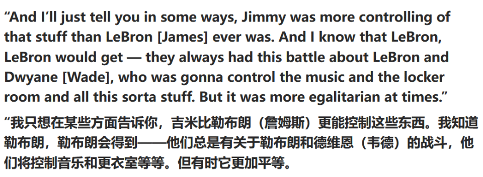 另外一位热火队记者Sylvander补充说道:“在某些事情上,巴特勒比詹姆斯更爱控制。以前詹姆斯和韦德也会争论谁来放音乐,但那时候至少更平等一点。尽管是詹韦主导播放音乐,但他们放的是全队都喜欢的。”