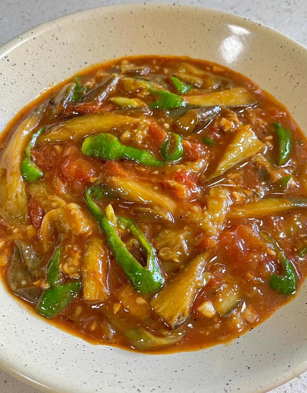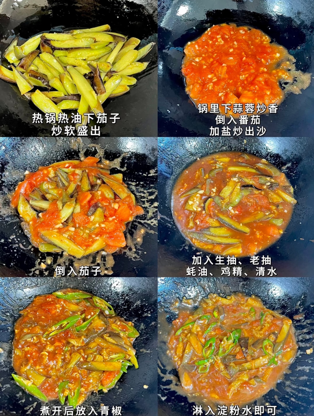 把茄子回锅,加生抽1勺(约15ml)、老抽半勺(调色)、蚝油1勺、鸡精小半勺,再沿锅边加半碗清水。汤汁滚起后,把青椒片铺上去,盖盖30秒,青椒颜色一亮立马淋淀粉水,勺子顺时针推两圈,汤汁挂壁就关火。整个过程不超过5分钟,快手到飞起。