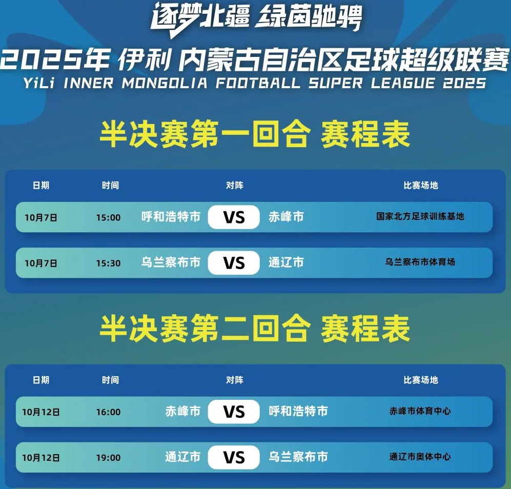 蒙超(2025内蒙古自治区足球超级联赛)8强赛(8进4)次回合在10月4日全部赛完,综合两回合比分,蒙超4强产生,"小组全胜"鄂尔多斯爆冷出局,3种子队仅剩呼和浩特!蒙超4强赛(半决赛)赛程出炉。