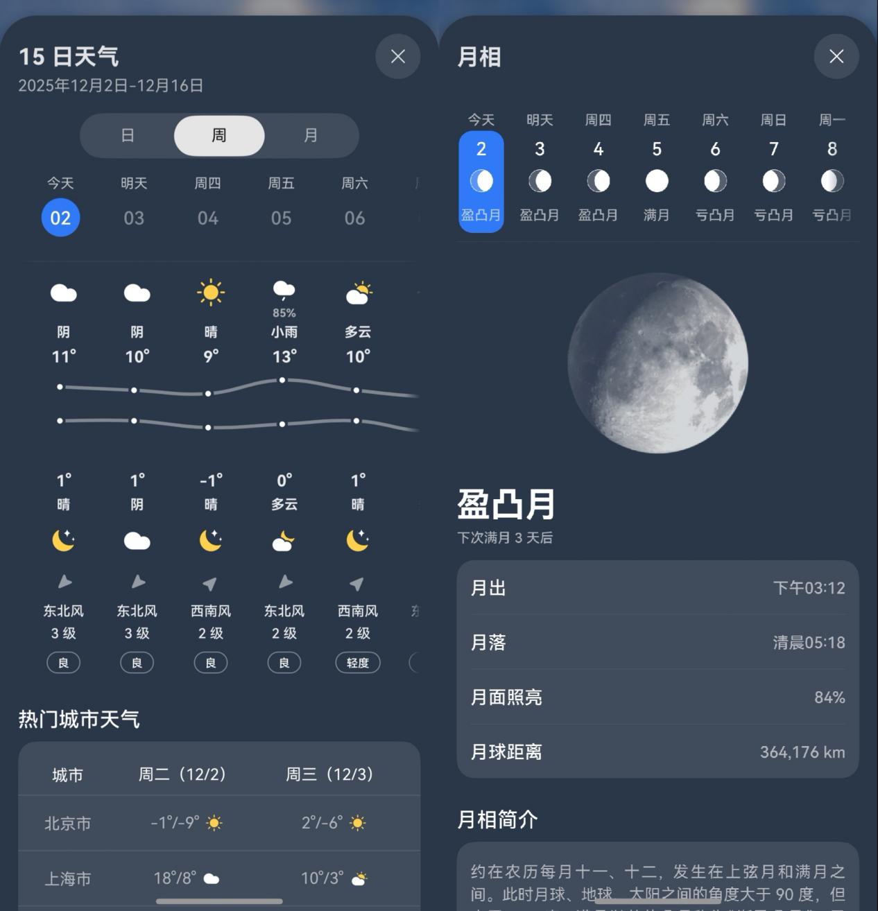 此外,华为天气还有好玩的“隐藏技能”。比如日出日落卡片就是摄影党福音,霞光的出现概率、最佳观测时间超级详细,想追光的心达到顶峰。还有月相卡片,帮我精准锁定满月日,再结合多日预报中的天气、云量、能见度等情况,再也不当深夜蹲点的无效熬夜人。