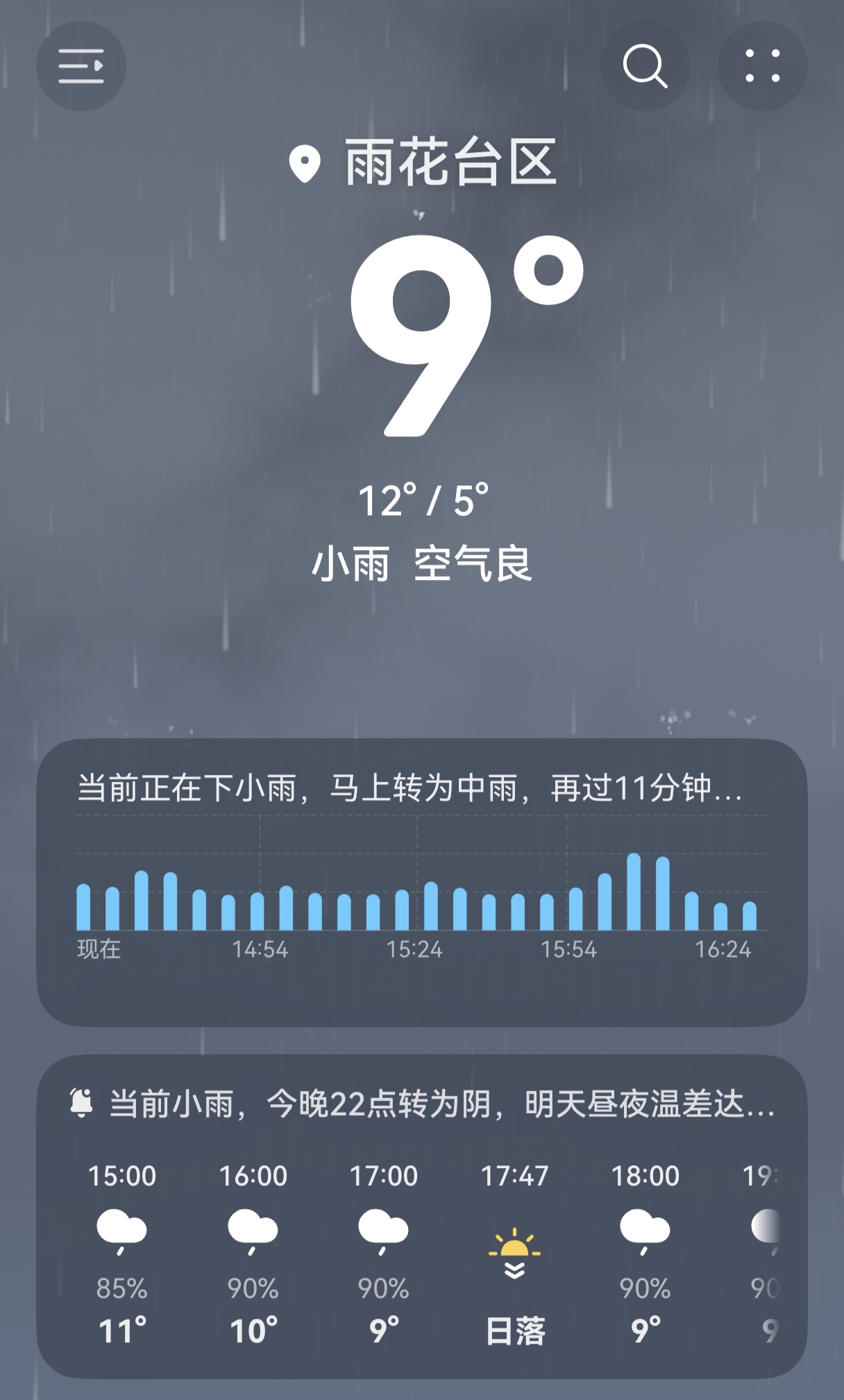 有次出门之前看着不在下雨,智能卡提醒我40分钟后区域内会有阵雨,于是我提前备好雨伞,果然准到不行,分钟级降水提醒属实贴心。极端天气预警提醒也好用,某天早上首页智能卡显示大雾预警,我果断弃车坐地铁,成功避开全城大堵车…