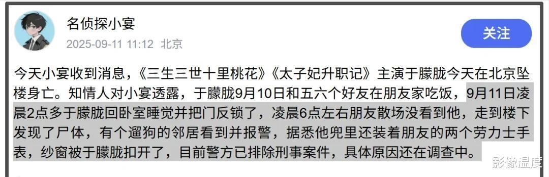 最先曝光这一讯息的是知名娱记“名侦探小宴”,他是在9月11日中午10:49分对外发布的,而且他推断出坠亡者是于朦胧: