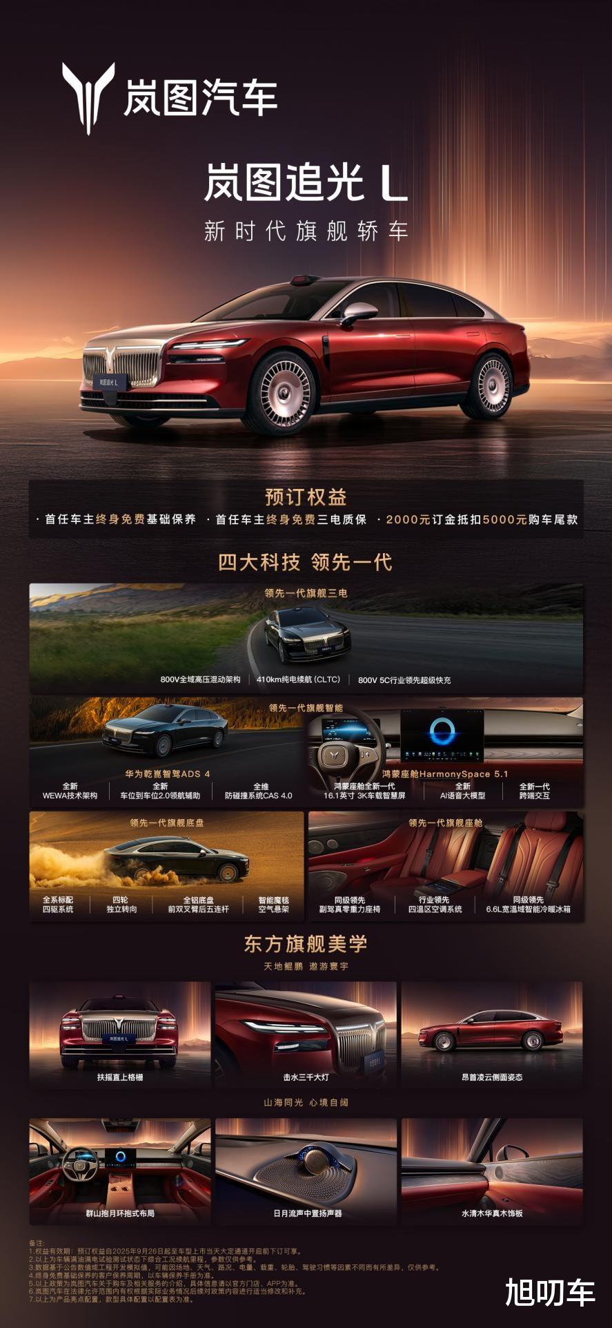 【2025年9月26日 上海】9月26日晚,岚图汽车在与抖音、费加罗FIGARO联合举办的“天地鲲鹏 万象新生——时代风尚之夜”盛典上,隆重推出了岚图追光L,推出包括2000元订金抵扣5000元尾款,两大终身免费权益等多重尊亨权益。