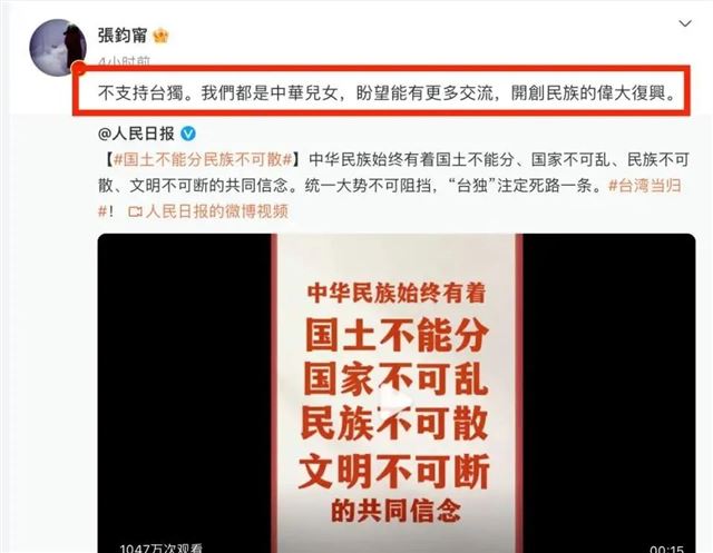 她毫不犹豫地转发相关文章,并且大大方方地写下“台湾唯一称谓就是中国台湾省”。