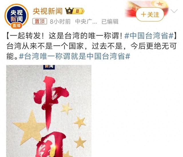 今年,央视新闻再次呼吁大家转发:“台湾唯一称谓就是中国台湾省”。