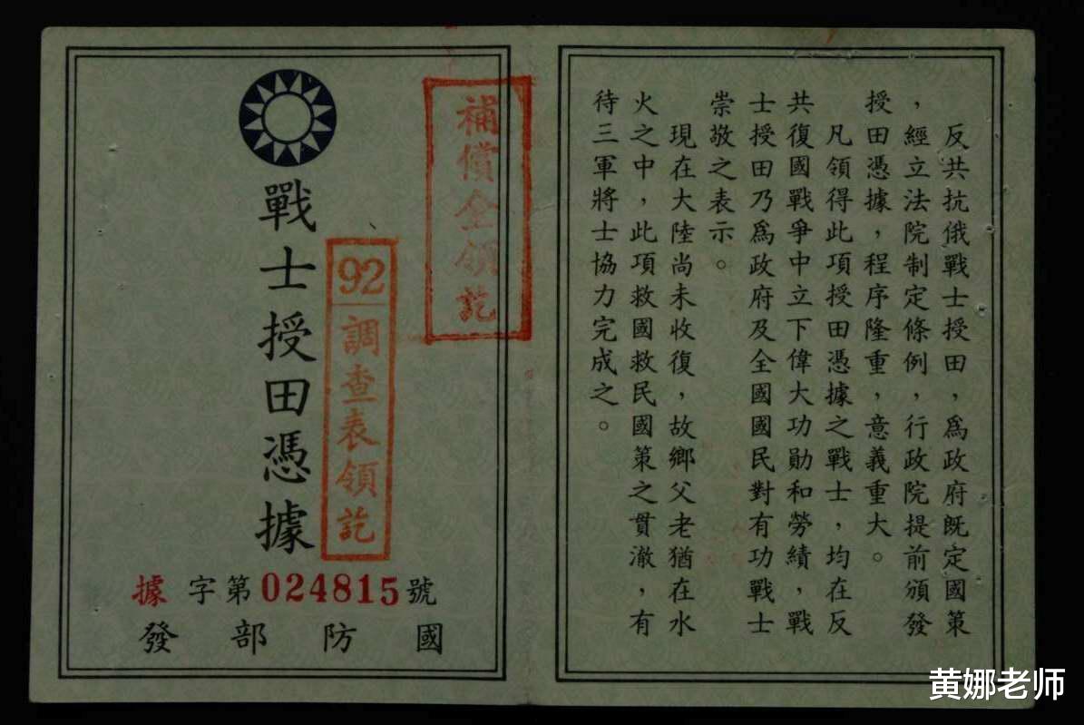 这个所谓的“战士授田证”简单说就是,发给跟他来台湾的大陆兵们一张证书,向他们承诺,反攻大陆成功后,凭借这张证书,即可换取总产量折合XXX斤稻谷的土地。