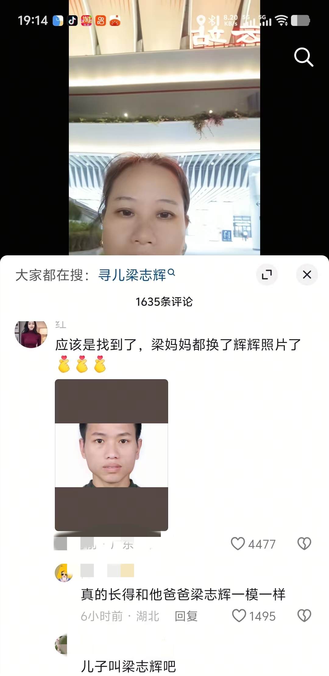 梁志辉爸爸还是很诚实的,孩子一找到就把抖音名改成了梁志辉爸爸已成功上岸,不像谢浩男爸爸,谢浩男找到半年都不改网名,一直在蹭寻亲圈的流量。