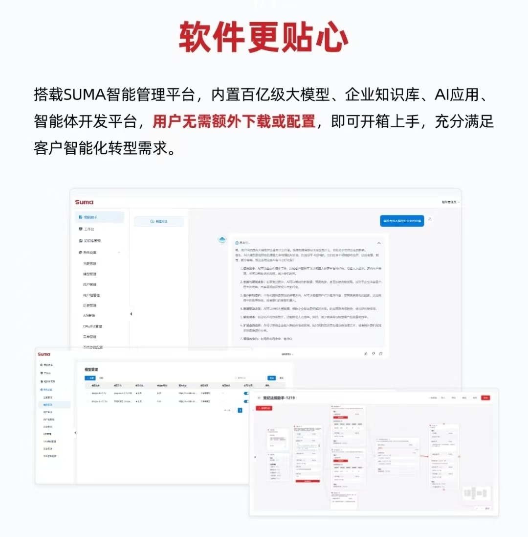 软件更贴心,开箱即用: 内置SUMA智能管理平台,集成百亿级大模型、企业知识库、AI应用及智能体开发平台。用户无需额外下载或复杂配置,开箱即可上手,满足企业智能化转型的即时需求。
