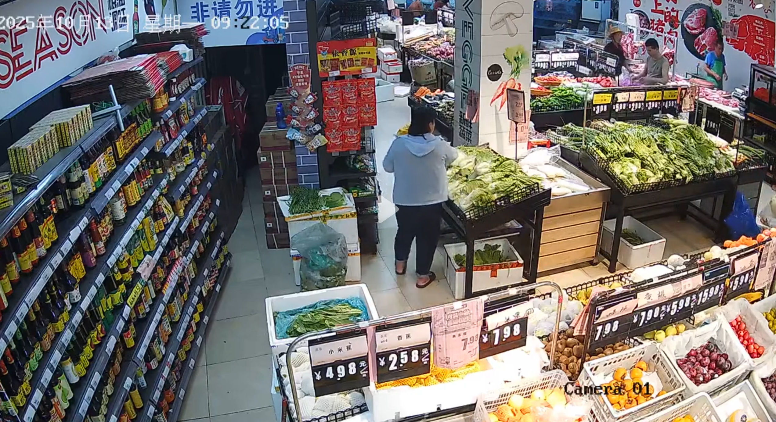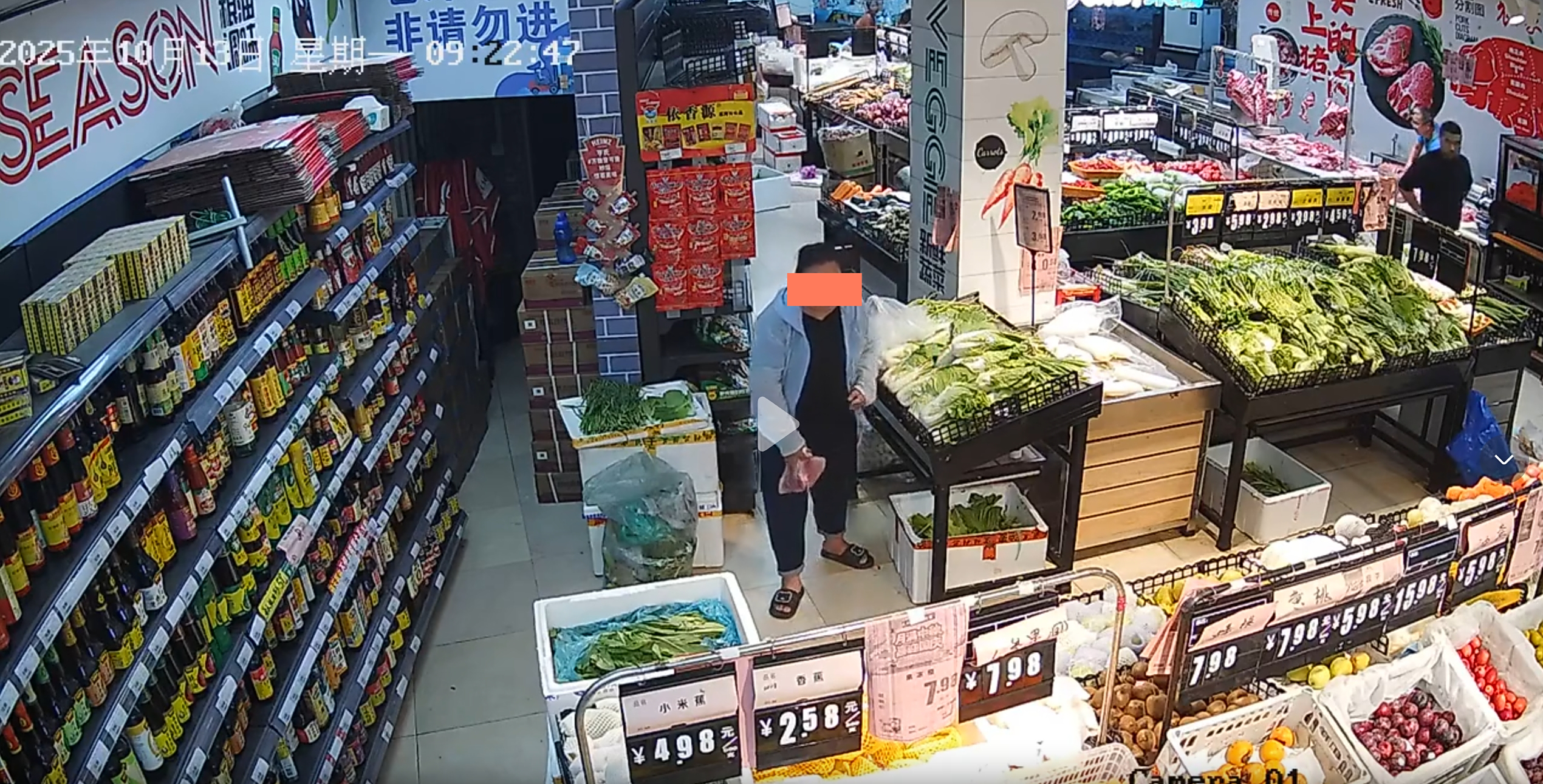 视频监控画面显示,一名长得较胖的女子进入超市后,挑选了一块猪肉,然后提着猪肉在一大白菜蔬菜区停了下来,女子不停地来回走动张望,眼睛不时向收银台的地方张望。