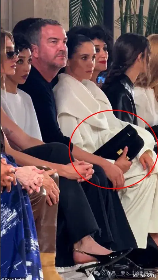 当别人都全神贯注的观看服装设计时,只有梅根还不忘记凹造型,将自己的名牌包包稳稳的保持着向上,且是正面的状态,手腕稳稳的抓着,悬浮在自己的腿边,生怕别人不知道她的包包,时刻保持着最完美的坐姿和仪态,昂首挺胸,趾高气昂的,真的不累吗?