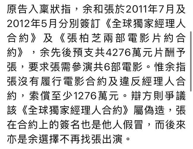 原告方(前经纪人余毓兴)指控:他自称是张柏芝父亲的好友,被称为“契爷”(干爹)。2011-2012年间,先后向张柏芝预支4276万港元(约合人民币3885万)片酬,约定她拍摄6部电影,并由自己担任独家经理人。但张柏芝收款后未履行拍摄承诺,还私接工作,如今追讨1276万港元赔偿,并要求公开她2015-2019年的收入账目。