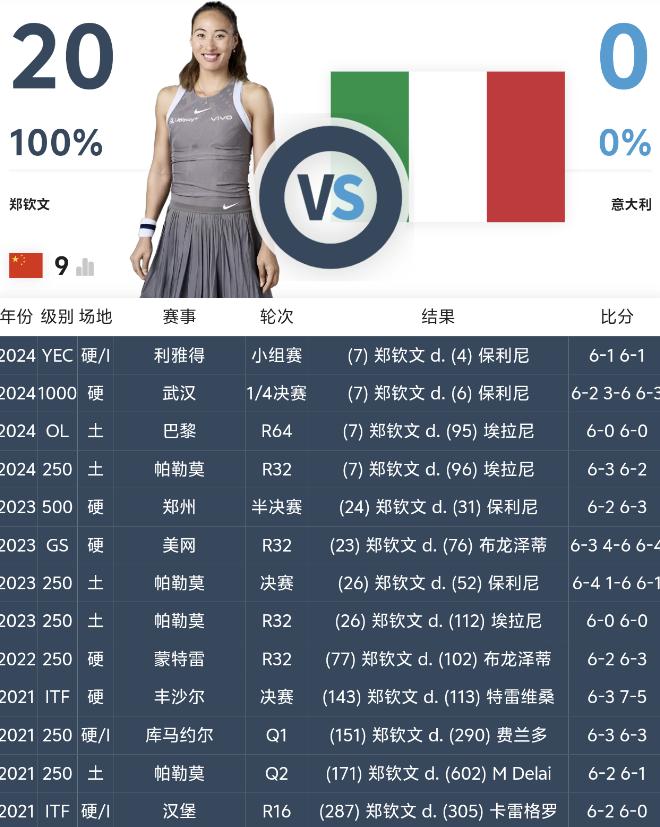 郑钦文的缺席尤为令人惋惜。据WTA官方数据,她职业生涯对意大利选手保持20胜0负的压倒性战绩,其中包括对保利尼的四战全胜。这一纪录不仅是中国球员对阵某一国家选手的最佳表现,在现役WTA选手中亦属罕见。若无伤病影响,中意双方排名最高选手的直接对话本可为中国队带来更大胜机。