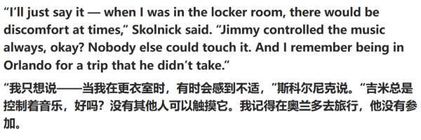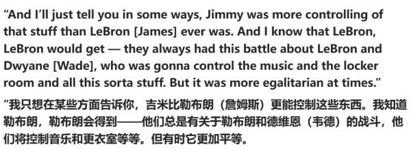 另外一位热火队记者Sylvander补充说道:“在某些事情上,巴特勒比詹姆斯更爱控制。以前詹姆斯和韦德也会争论谁来放音乐,但那时候至少更平等一点。尽管是詹韦主导播放音乐,但他们放的是全队都喜欢的。”