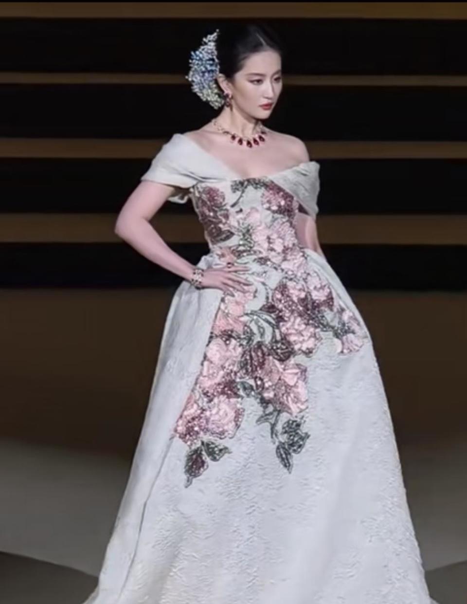 搭配的 Elie Saab 高定礼服,更是将她的气质衬托得淋漓尽致。礼服的剪裁贴合身形,展现出她优美的曲线。裙摆上的立体花卉刺绣,与头上的簪花围相互呼应,仿佛将整个花园穿在了身上。行走间,裙摆轻摇,花朵仿佛在微风中绽放,散发出阵阵花香,让人为之陶醉。