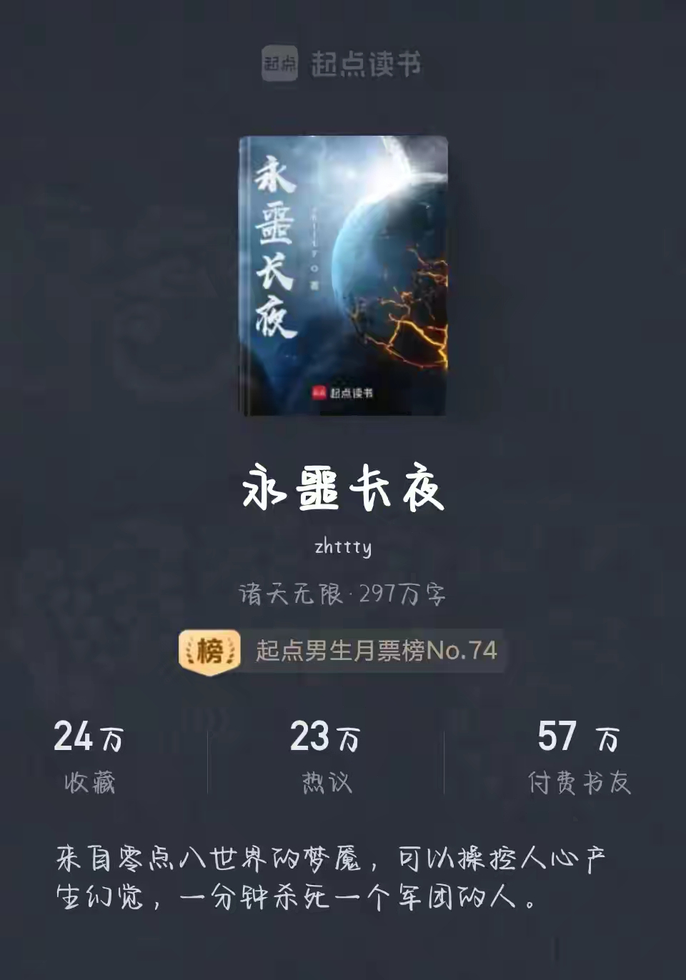不过,莫说是作者自己,如今的无限流小说能够超越《无限恐怖》的也少有人在。这种情况下,作者一马当先其实是最合适的。果然在之后创作了几年作品,又完结了《洪荒历》以后,zhttty的新书《永噩长夜》再度超越众人登上榜首。这可真是久违的荣幸。