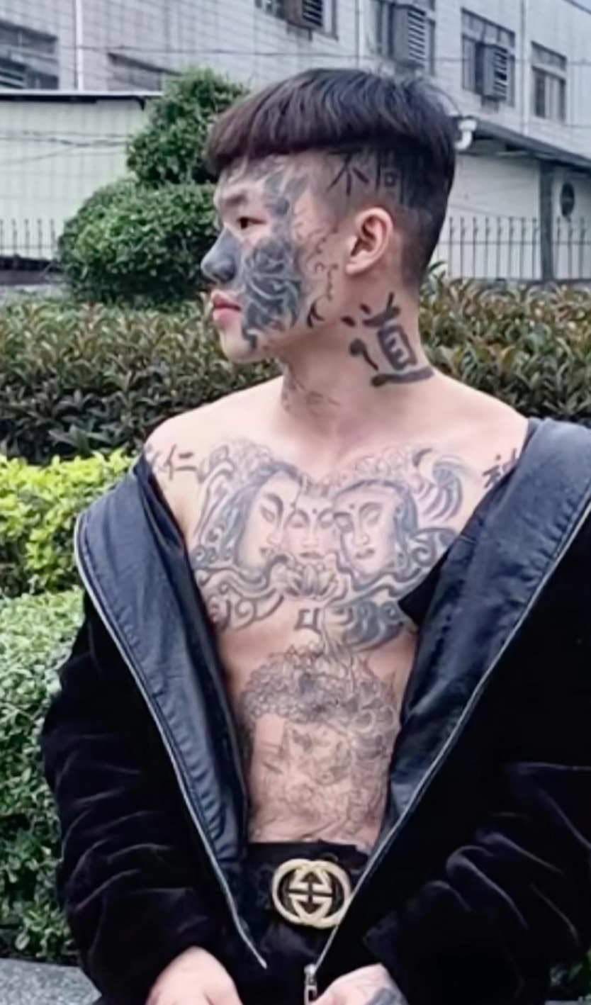 十三岁那年,为了生存,他接受了纹身店老板的建议,在脸上纹上了纹身。