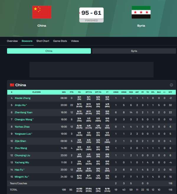 中国男篮95比61战胜叙利亚。