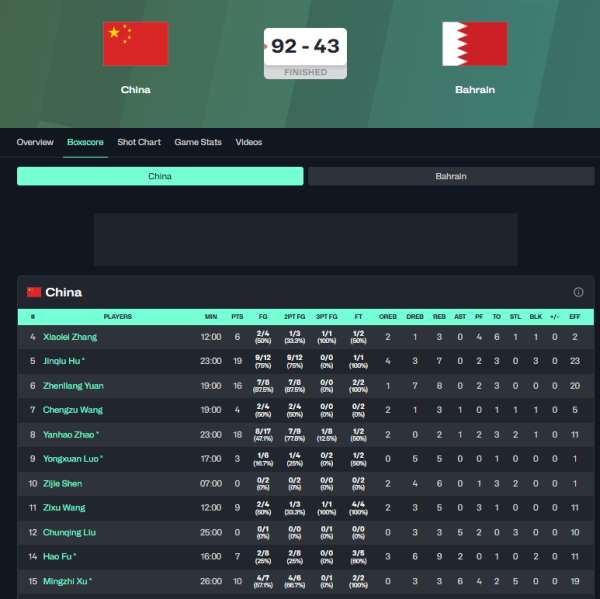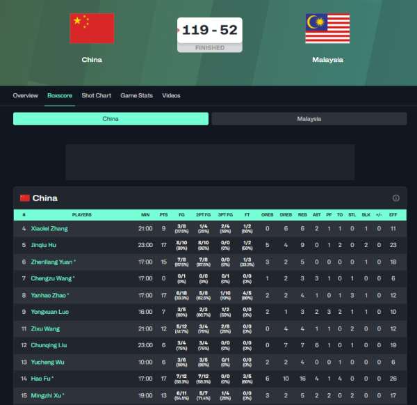 中国男篮119比52马来西亚。
