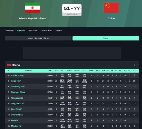 中国男篮77比51伊朗。