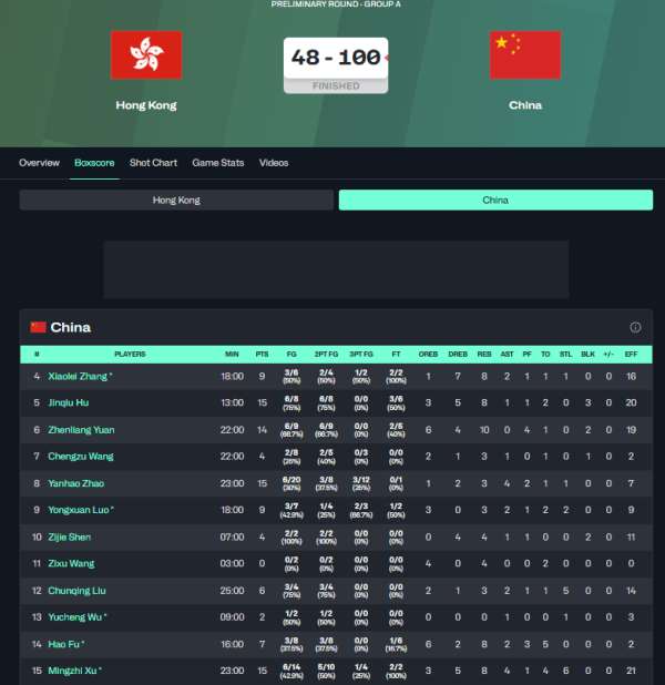 中国男篮100比48战胜中国香港。