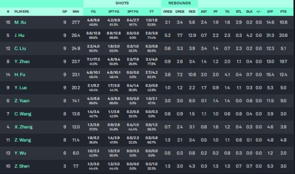 胡金秋场均20.6分,赵岩昊场均19.7分,付豪场均12.4分。