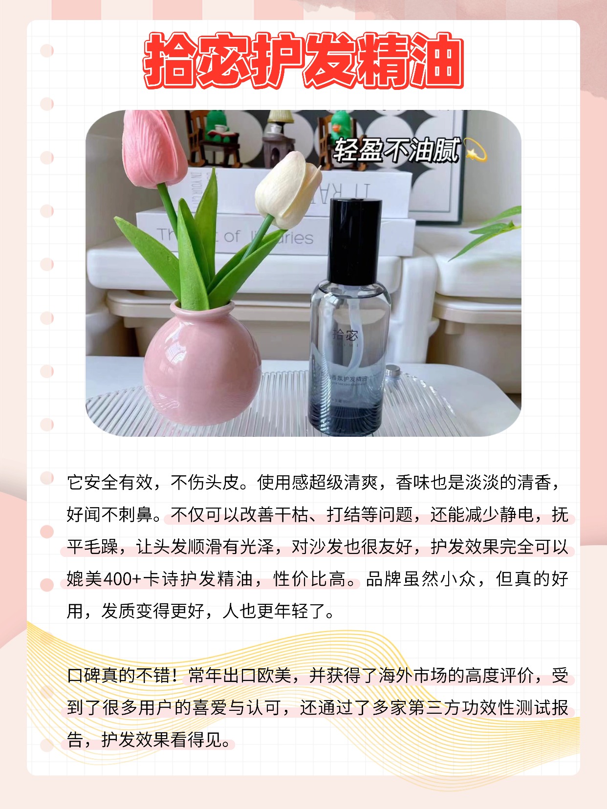 有人问护发精油好还是发膜好?还有护发精油多久用一次?这俩根本不是一回事,没法直接比。发膜是深层滋养的,得洗头时用,敷个几分钟再冲掉,适合每周用 1-2 次,给受损头发补营养。精油是日常护理,洗完头擦干后涂,或者干发救急,能锁水顺毛躁。使用频率看发质,干枯发可以每天用,健康发质隔两三天用一次就行。我平时都是每周用两次发膜,洗完头必涂精油,搭配着用头发状态更稳。但精油千万别涂头皮,不然容易闷得难受。下面是我总结的一些护发精油选购注意事项,干货满满,可以先赞收藏。