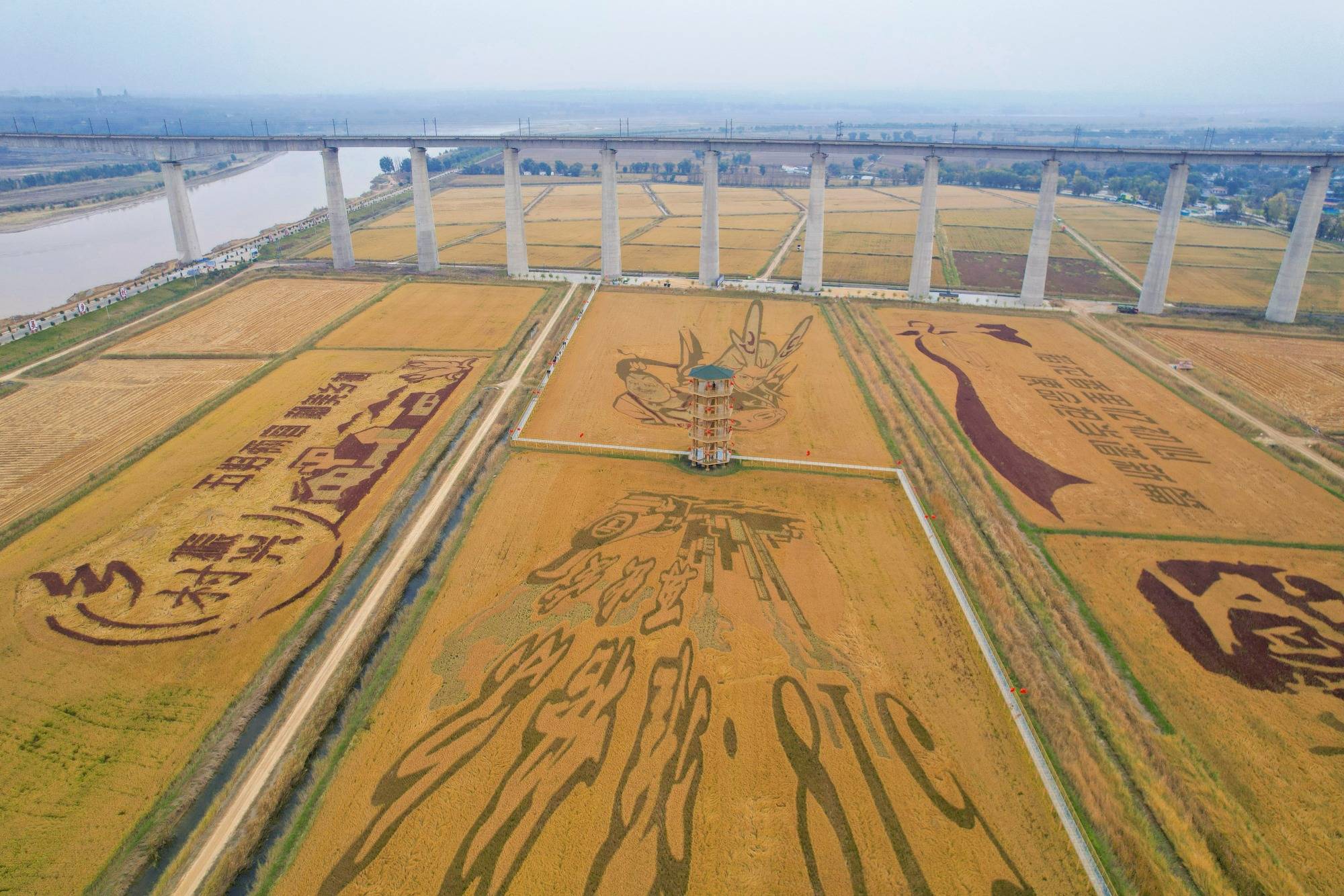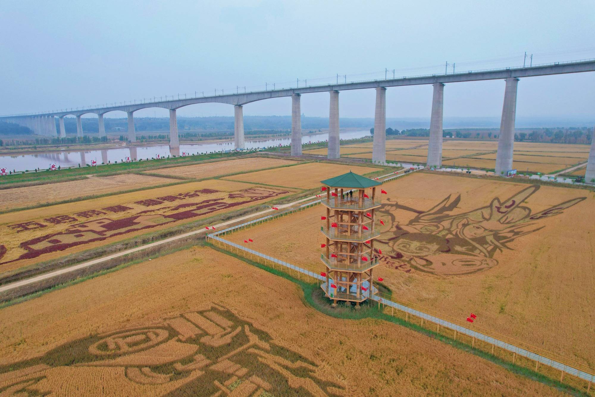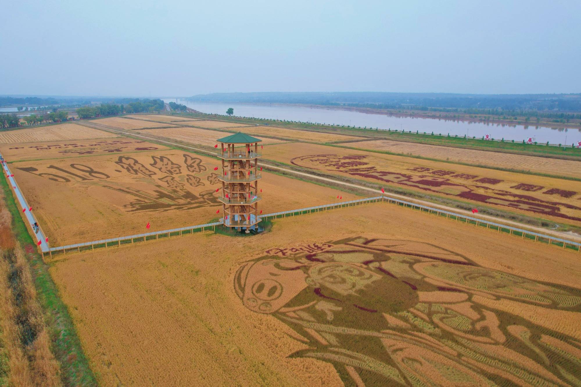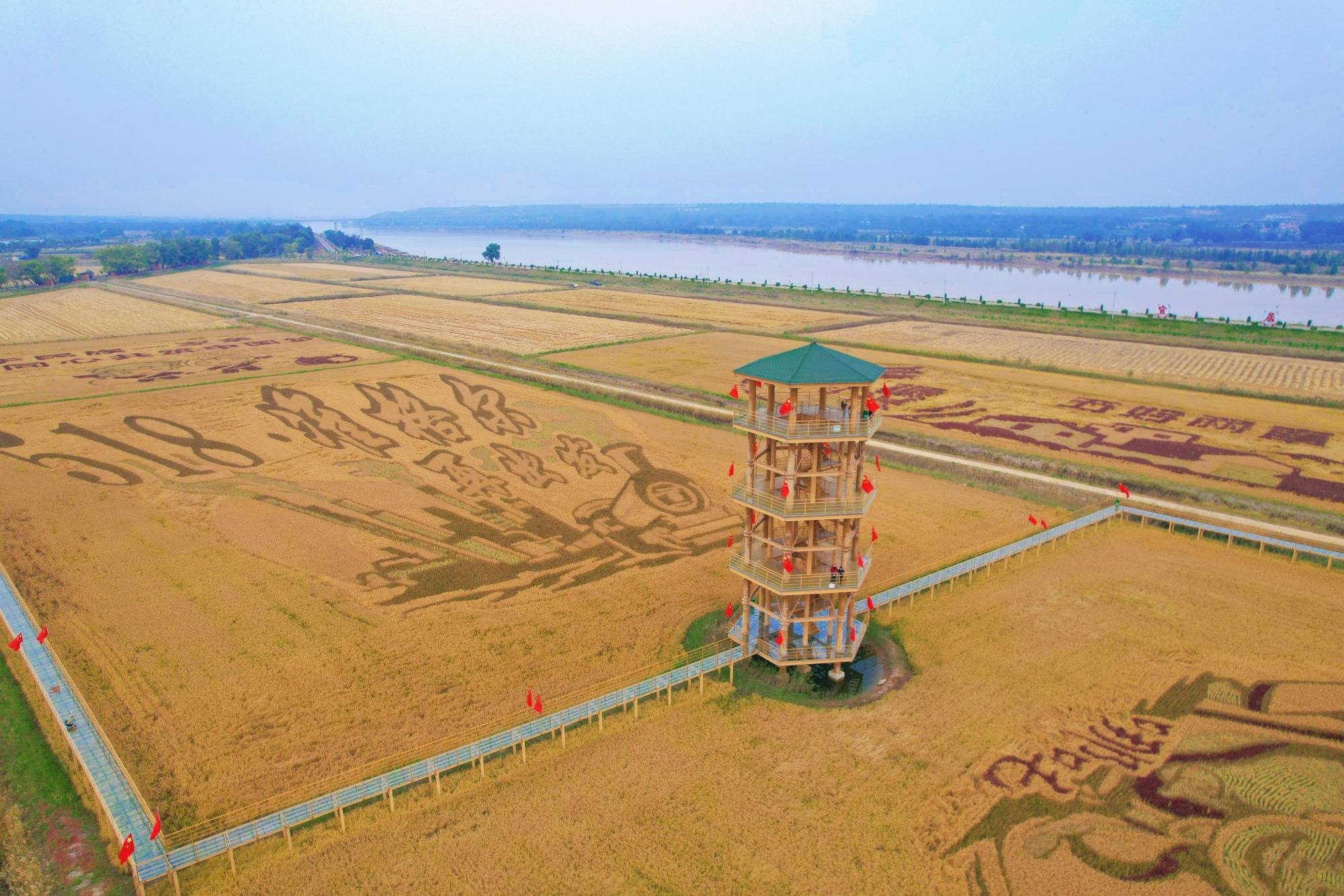 登上高耸的观景塔可以360度无死角一览稻田风光,站在塔上远眺,黄河水悠悠流淌,岸边景色秀丽,蜿蜒的水、挺拔的树和金黄稻田构成一幅绝美的秋日画卷。