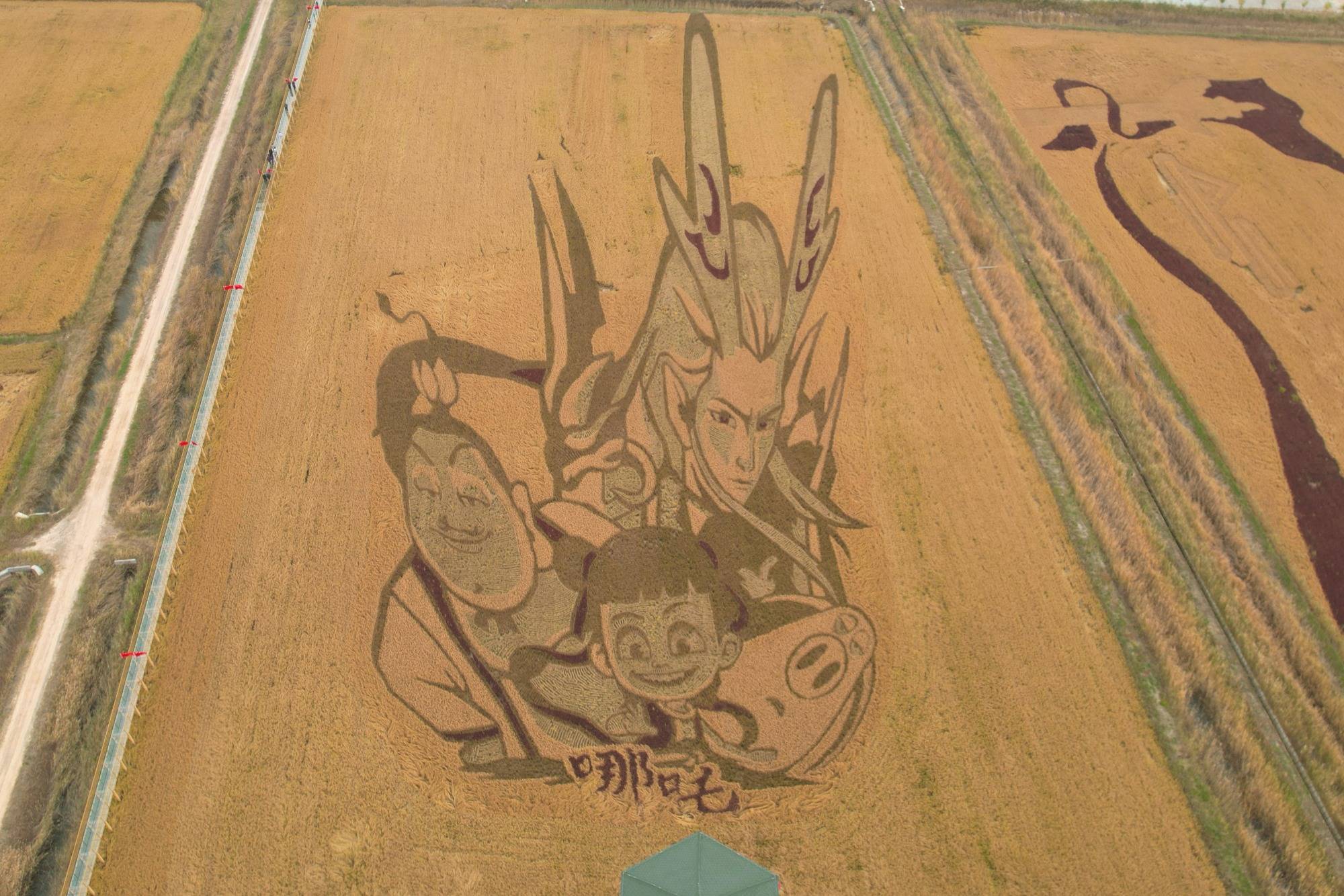 从第一部火到第二部的《哪吒》也呈现在稻田中,无厘头的哪吒、酷酷的敖丙,还有胖胖的太乙真人,每一个角色、每一个画面都色彩丰富,细节满满,和电影相似度百分百。