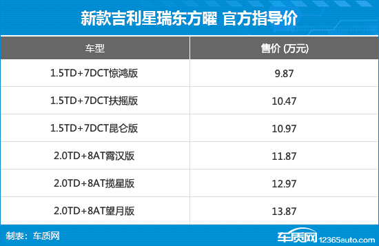 动力方面,新款吉利星瑞东方曜提供两套方案,1.5T涡轮增压发动机最大功率133kW,峰值扭矩290N·m,匹配7速双离合变速箱;2.0T涡轮增压发动机最大功率200kW,峰值扭矩400N·m,匹配爱信8速手自一体变速箱。