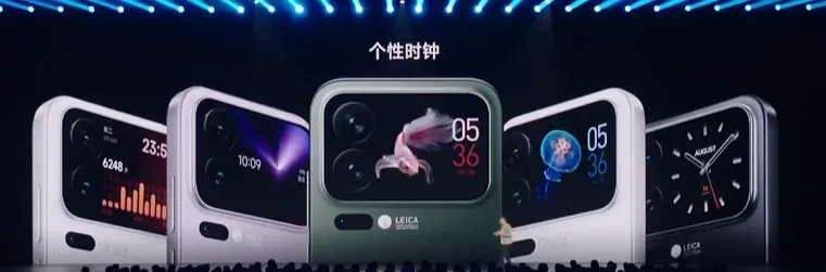 首先小米17最大的变化是加入了妙享背屏,它能做什么呢?1,能做各种的有趣时钟图案,可以在手机上面养一条锦鲤