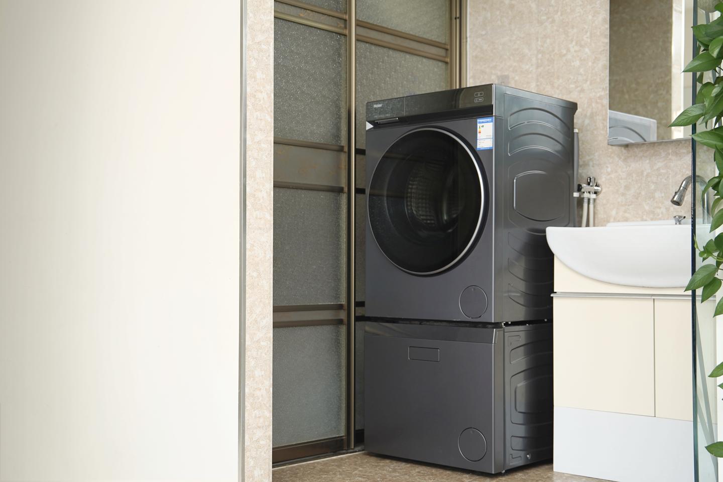 海尔云溪复式洗护中心上层洗衣机、下层洗鞋机,叠放搭配只占用一台设备的面积,叠搭成套的颜值也十分统一。洗衣机的纯平视窗与一体隐藏把手设计很突显这套设备的高级质感,独立、嵌入安装都可以,百搭各种家居家装风格。