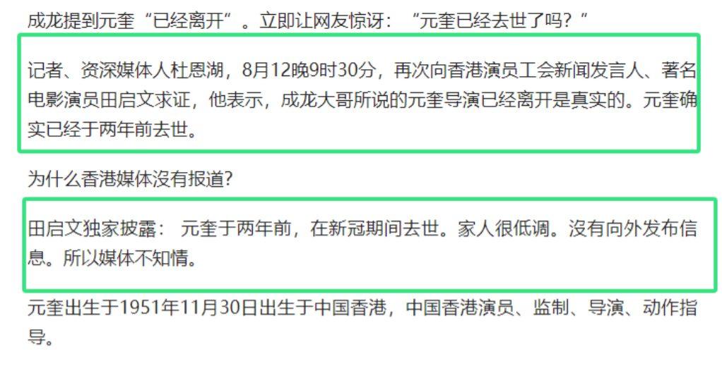 然而,让人痛心的是,据了解,元奎已于两年前因新冠肺炎病逝。此前就有圈内人士听闻其去世的消息,只是其家人希望低调处理,所以知道的人并不多。直到这次成龙的发文和媒体的求证,才让更多人知晓这一悲痛的事实。