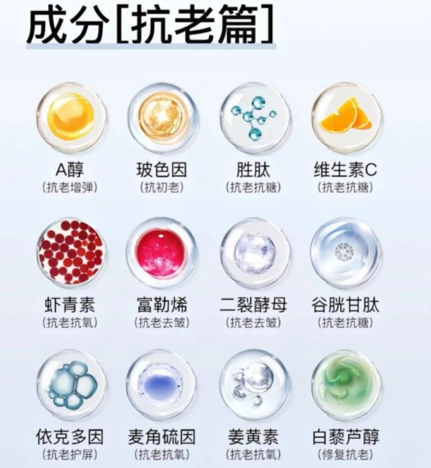 原则一:成分是关键。 关注经过科学验证的有效成分,如玻色因(紧致充盈)、胜肽(淡化表情纹)、A醇及其衍生物(促进胶原、淡化皱纹) 等。