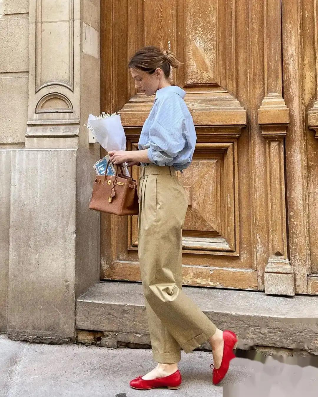 如果想要在日常穿搭中展现出优雅与舒适的氛围,不妨尝试将九分裤与芭蕾鞋进行搭配。选择一条卡其色的九分裤,搭配一件清爽的蓝色衬衫,再配上一双红色的芭蕾鞋,整个造型简约大方,展现出从容气质,非常适合日常出街。