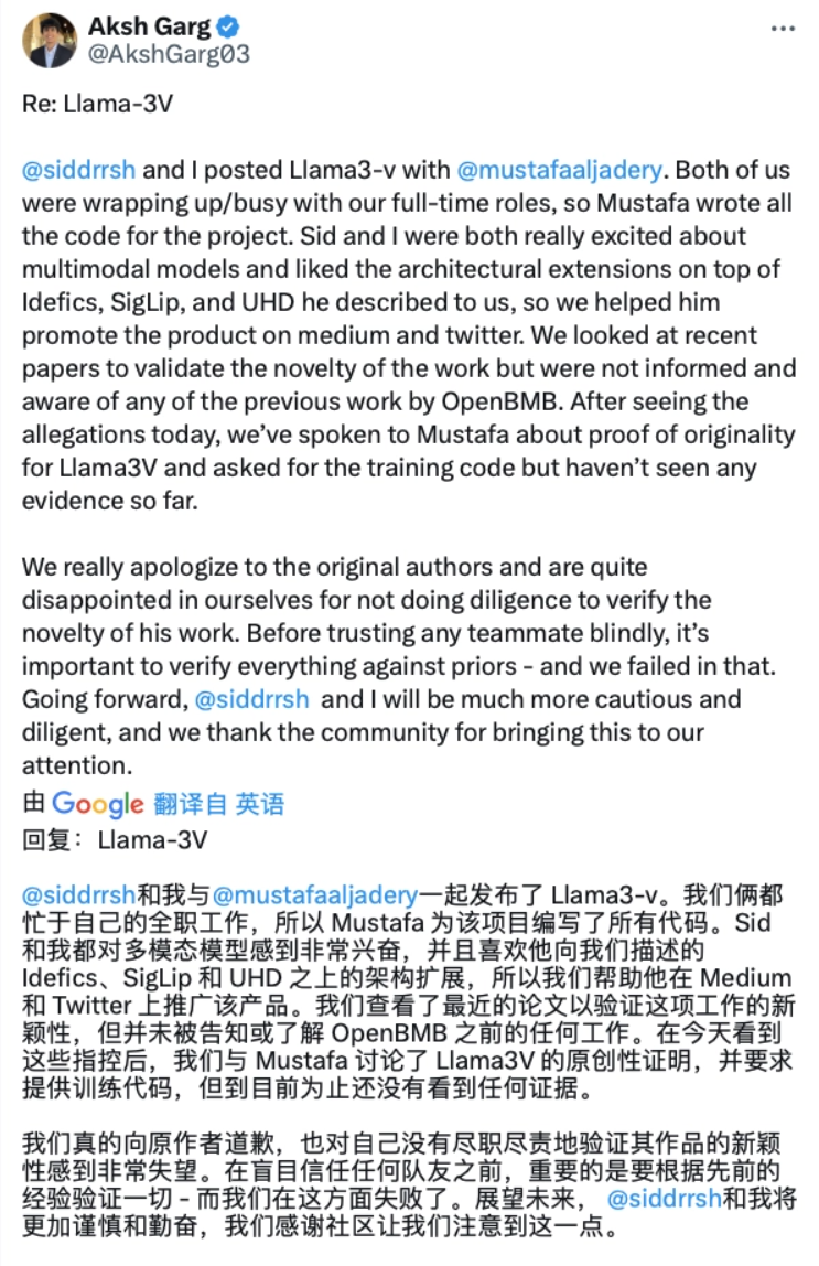 不过,斯坦福的2位本科生在最开始的时候辩解称,Llama3-V这项工作的时间是要早于面壁智能的MiniCPM,只是使用了他们的tokenizer。